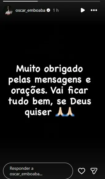 O jogador publicou uma mensagem de agradecimento em suas redes sociais. “Muito obrigado pelas mensagens e orações. Vai ficar tudo bem, se Deus quiser” – escreveu Oscar no seu stories do Instagram.