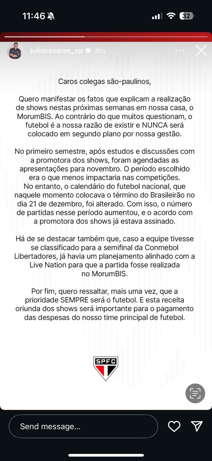 Diante da repercussão, o presidente Julio Casares se manifestou em suas redes sociais, justificando como foi feita a decisão do acordo com a Live Nation, explicando por que houve o acúmulo de apresentações em novembro e, por fim, negando o descaso com o futebol.